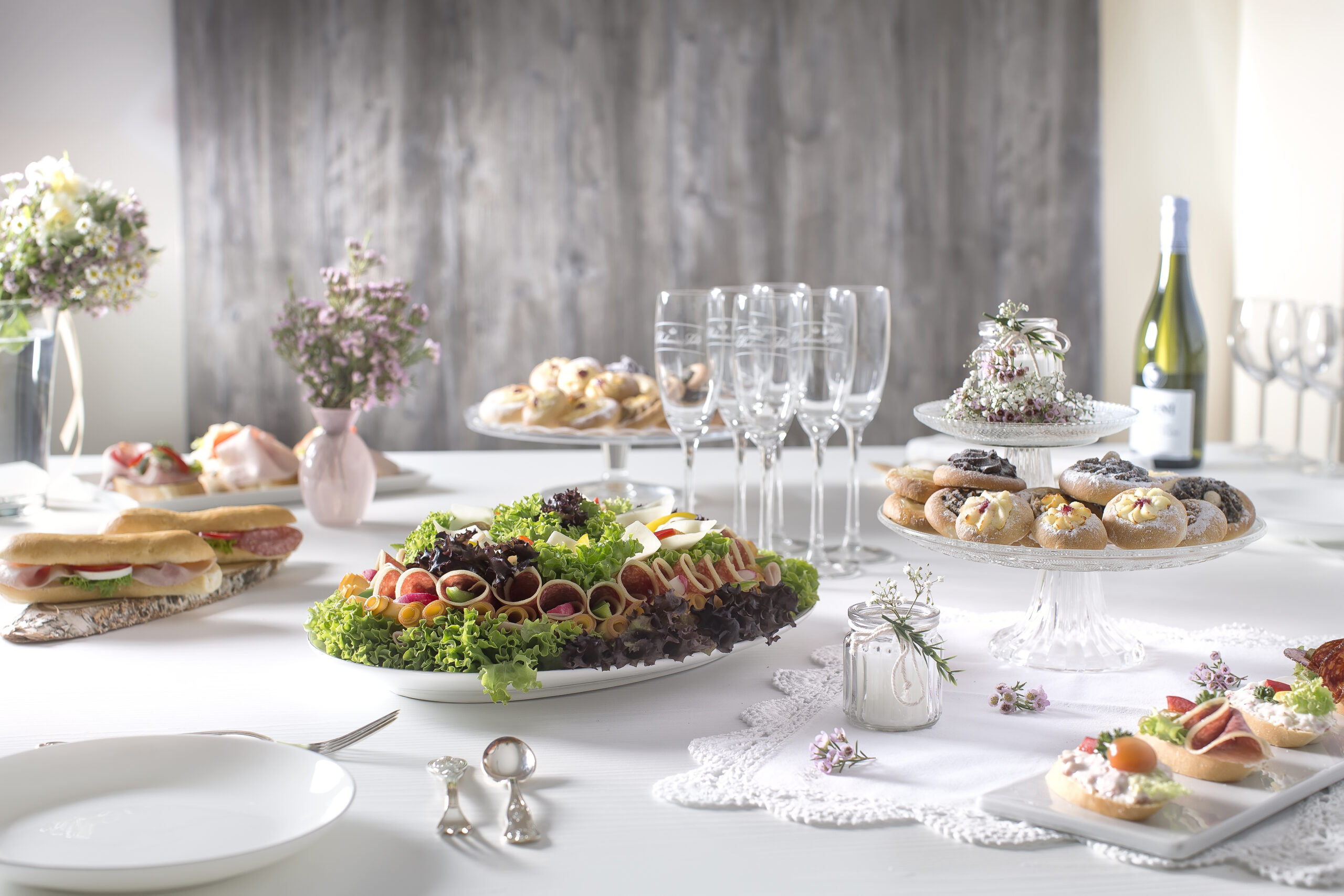 Dezerty, svatební koláčky, kanapky a obložené mísy pro váš svatební den. Vše připravíme s maximální péčí, aby stačilo jen prostřít a užít si naplno váš vyjímečný den.