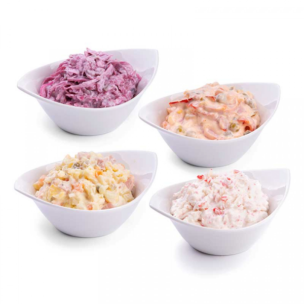Cold savoury salads made with vegetables, pickles, diced sausage or eggs, all mixed in a light mayonnaise dressing.