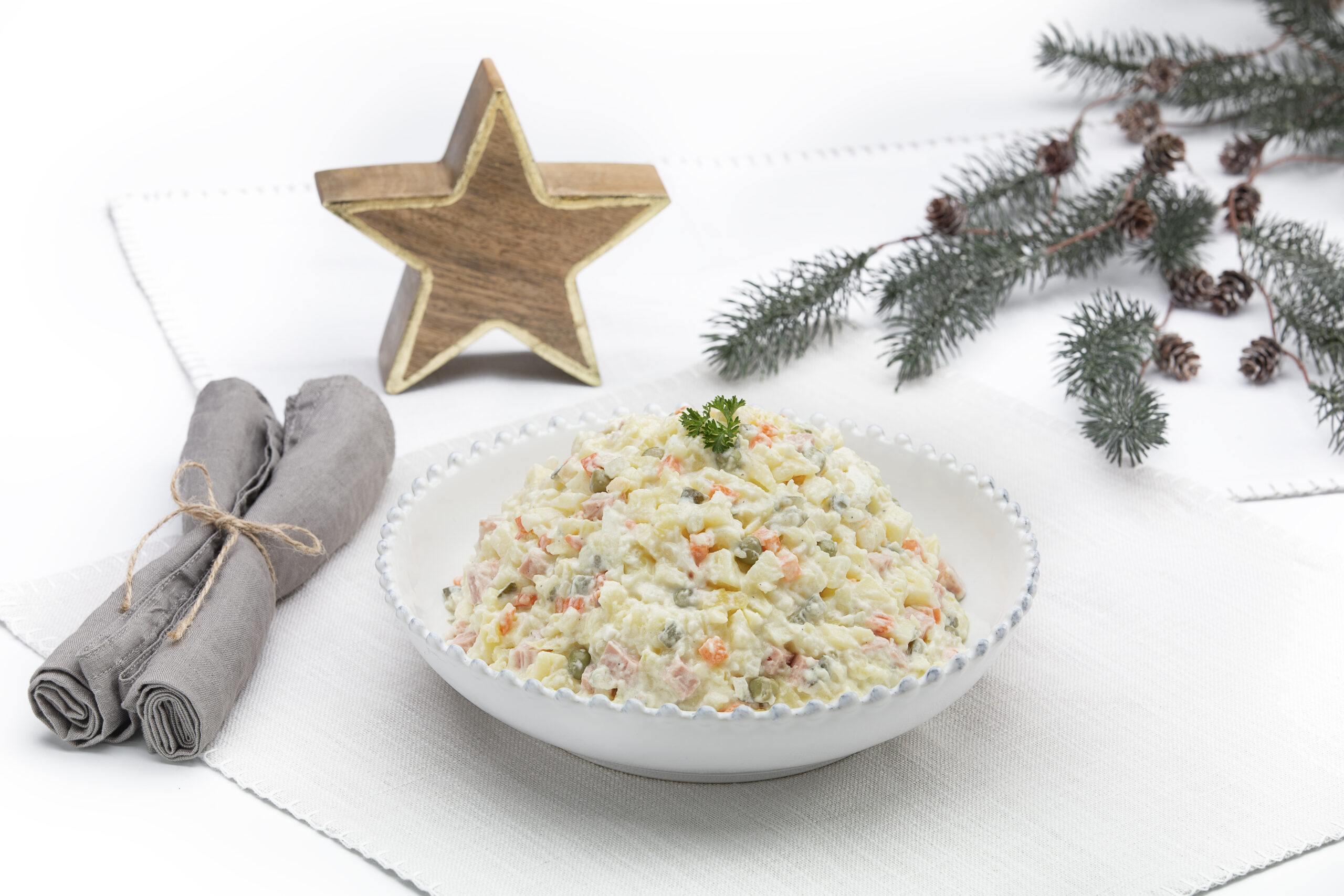 Bramborový salát připravujeme podle vlastní receptury, kterou ladíme roky. Je vyvážený, krémový a přesně takový, jak má český vánoční salát chutnat.